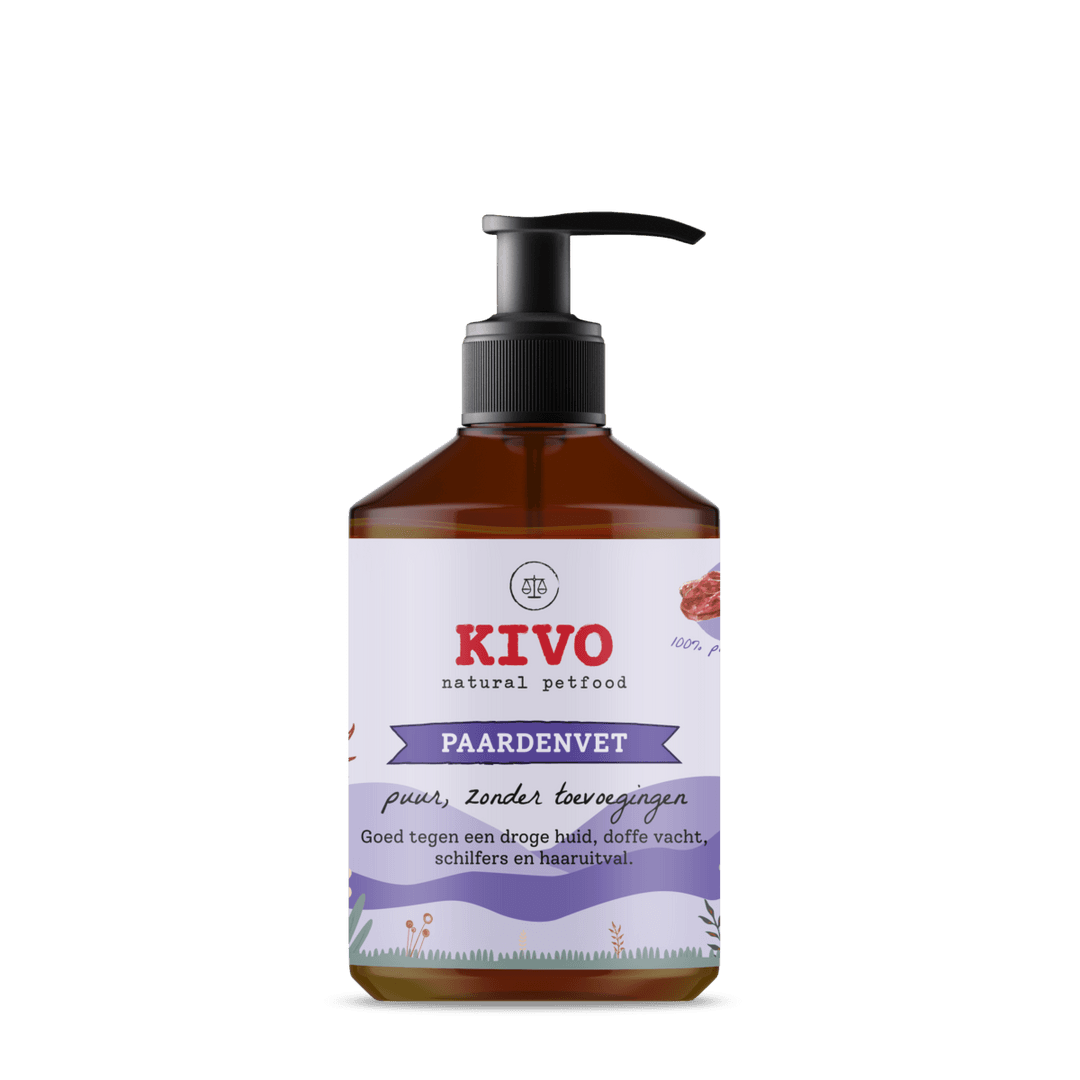 Een scheutje van dit supplement zorgt ervoor dat je trouwe vriend lekker in z’n vacht zit. Er zit naast omega 3 namelijk glycerine in en dat is een goed goedje. Deze is in staat om vocht vast te houden in de huid en daardoor heeft het een groot herstellend vermogen. Hij werkt perfect tegen schilfers, haaruitval en een doffe vacht. Dit supplement bestaat uit 100% paardenvet en is vrij van toevoegingen. We hebben ‘m gesmolten en daardoor is het een mooie olie. Bewaar ‘m wel op kamertemperatuur en niet in de koelkast, anders transformeert hij van een vloeibare olie terug naar een vast vet. Dan wordt pompen een stuk lastiger.