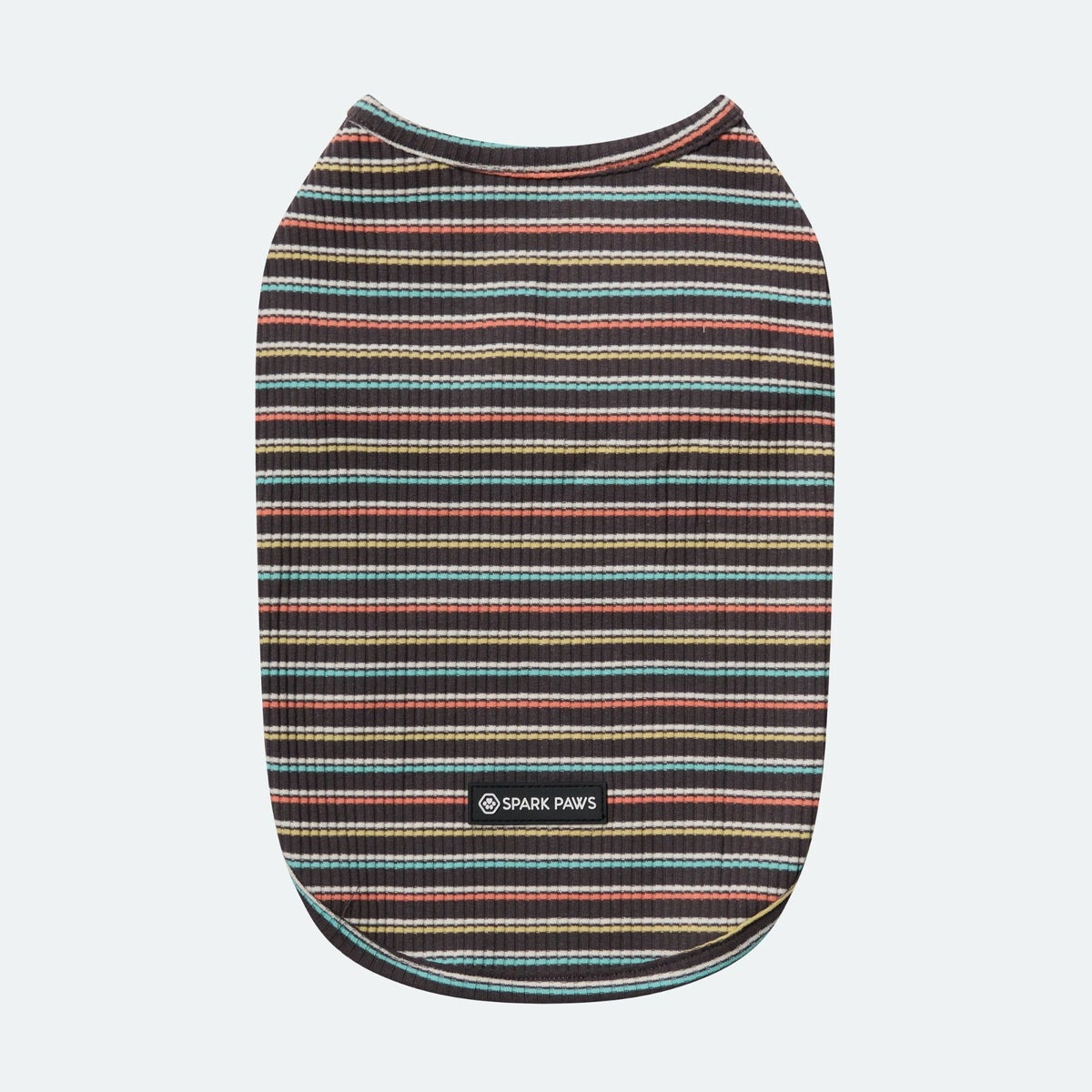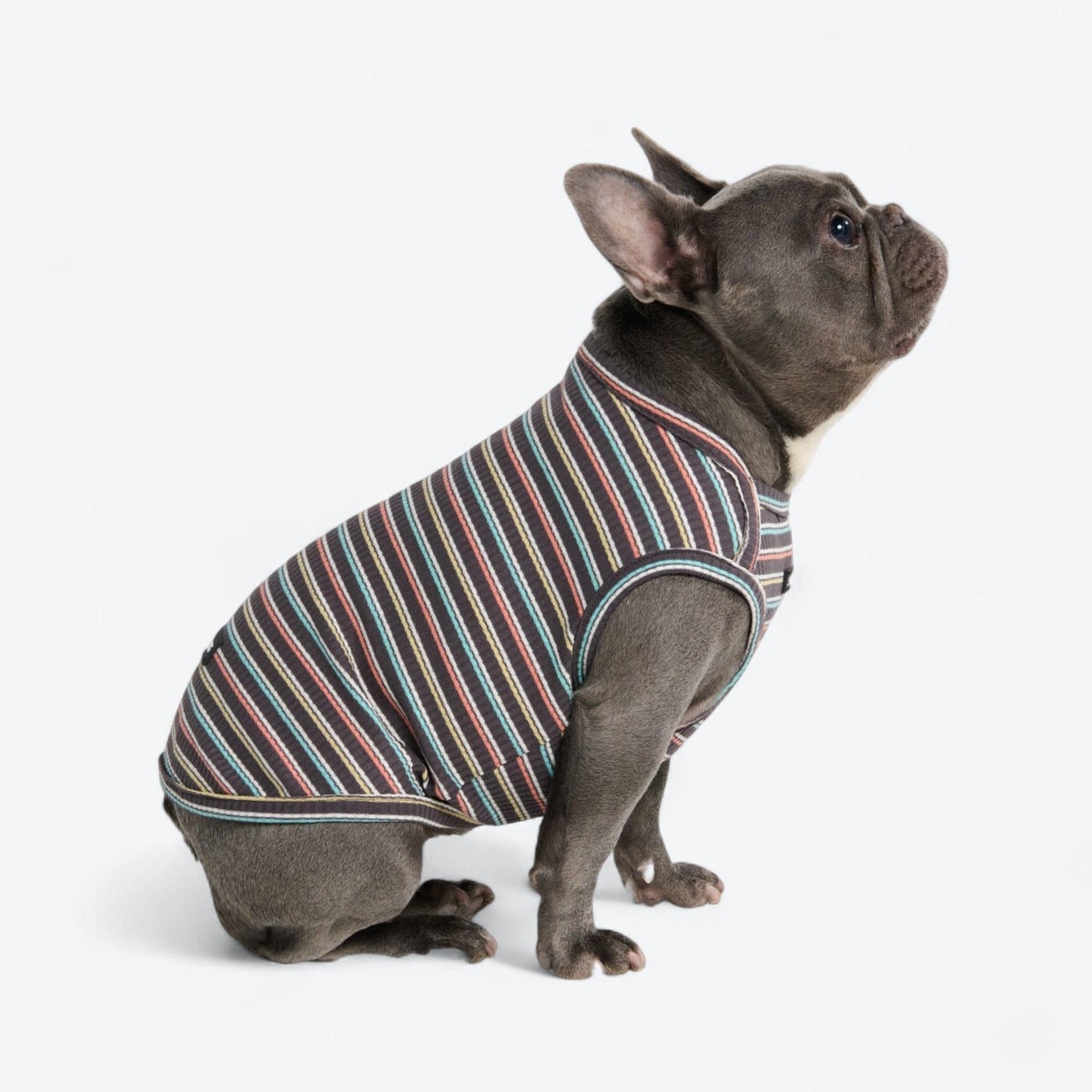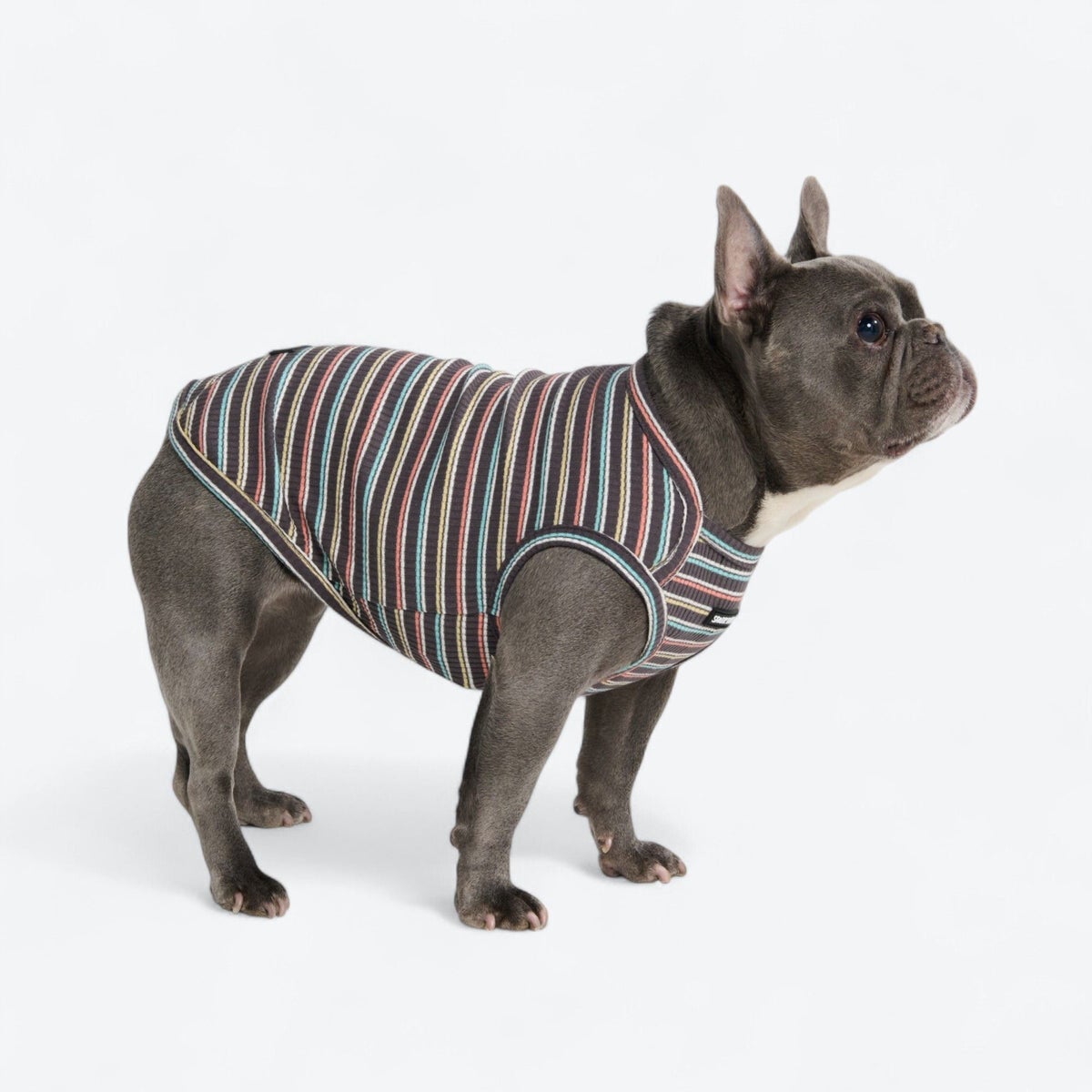 Voeg een vleugje kleur toe aan de garderobe van je hond met dit pastelkleurige gestreepte shirt — perfect voor zonnige wandelingen, knuffels en complimentjes.