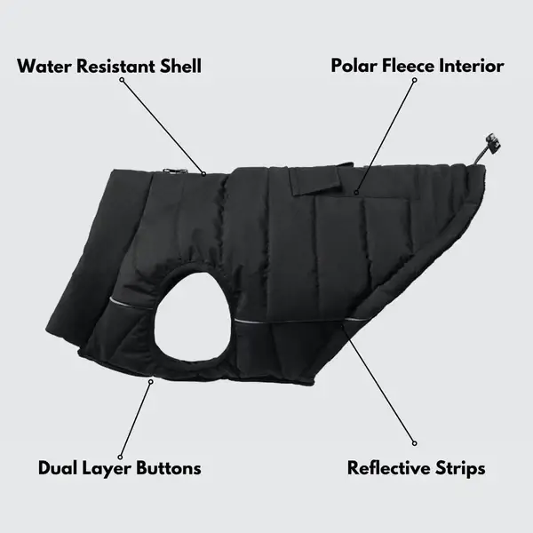 Deze gestroomlijnde, op techwear geïnspireerde parka houdt je hond droog en warm op de koudste winterdagen.